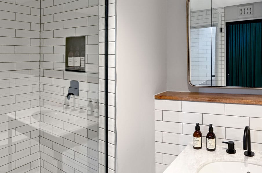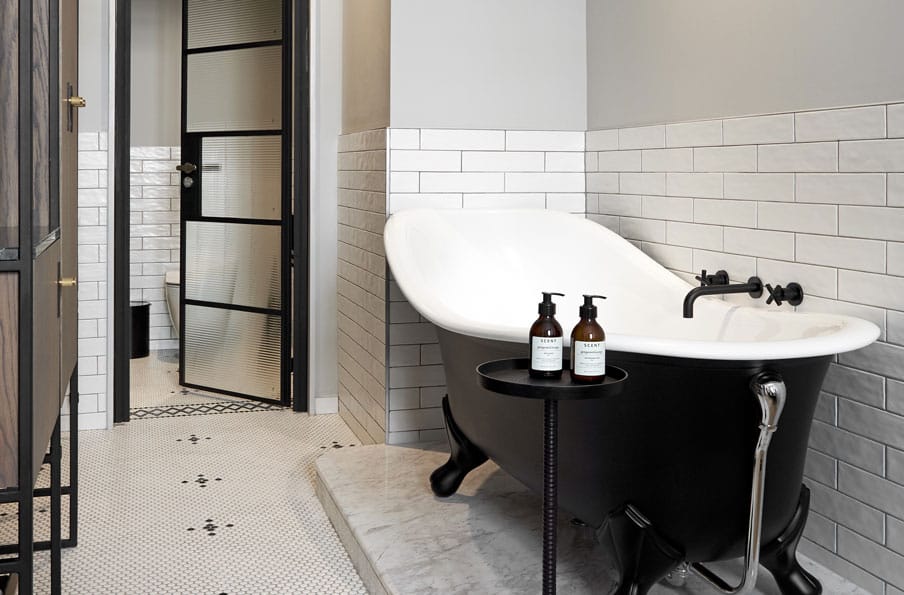 Spread out in our one-bedroom suites which have an extra length king size bed (oh yeah!) and separate lounge equipped with an additional 55-inch Smart TV. The separate bathroom off the lounge has a large walk-in rain shower, freestanding loo and our signature single basin on custom designed Gregor Jenkin hand turned stainless steel legs with penny tile flooring throughout.